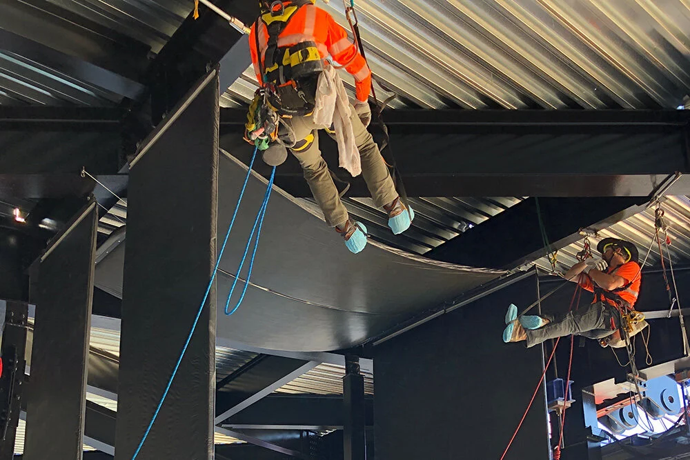 SFA installs Lapendary Panels exclusively by means of rope access. This technique is highly specialized and performed only by trained and certified technicians. A unique and dangerous job, this type of vertical access requires experience and expertise. Our partners in installation have unparalleled knowledge of the rigging industry, and we leverage their proven track record of implementing custom installations for our arena acoustics.